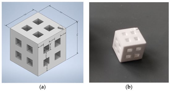 In the first test, two cubes with sides of 5 mm, each with four windows of 1 mm by 1 mm, were printed and sintered at 1050 °C for measurement (Figure 3).