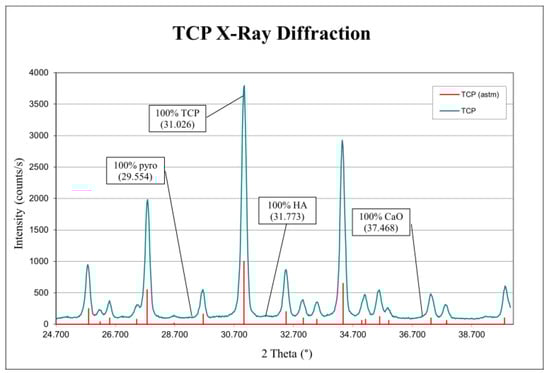 X-ray diffraction spectrum of a printed matrix. This illustrates the β-TCP and that no pyrophosphates, hydroxyapatite, or lime were detected.