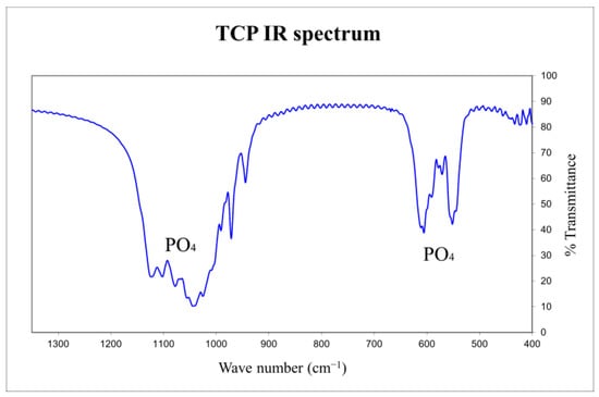 Furthermore, infrared spectroscopy graph analysis matches our X-ray analysis, and we observed the absence of characteristic pyrophosphate bands (using the absorption band at 721 cm−1 characteristic of the stretching vibration of the pyro group’s P-O-P bond, infrared is the most sensitive method for detecting the presence of pyrophosphate in TCP).