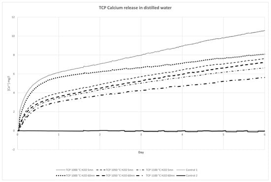 To study the ionic release of our material, we observed the conductimetry variation of distilled water, in which we immersed printed pellets that were 11.5 mm in diameter and 2.1 mm in thickness with a mass of 0.55 g. Pellets were printed according to our technique and then sintered. We studied the effects of three temperatures, namely 1000 °C, 1050 °C and 1100 °C, and sintered two pellets for each temperature. Finally, for each temperature, one pellet was washed for 5 min and the other for 1 h before being sterilized at 170 °C for 1 h. We developed a specific device to test eight samples in parallel, leaving the samples in pure water for 6 days. To convert these conductimetry results into a Ca2+ assay, we used an AQUION ICS900® (Thermo Fischer Scientific, MA, USA) ion-exchange chromatography system.