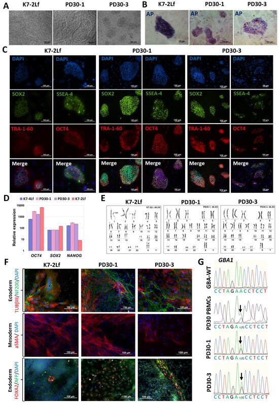 Characterization of the iPSC cell lines K7-2Lf, PD30-1 and PD30-3. (A) Cells exhibit typical iPSC morphology. (B) iPSC colonies are positively stained for alkaline phosphatase (AP). (C) Immunofluorescence analysis revealed expression of the pluripotency markers OCT4 (red signal), SOX2 (green signal), SSEA-4 (green signal), TRA-1-60 (red signal). (D) Quantitative analysis of NANOG, OCT4 and SOX2 expression was performed by RT-qPCR. Error bars indicate the standard deviation. (E) Chromosome analysis demonstrated a normal karyotype (46,XX) for all three cell lines. (F) Immunofluorescence staining for differentiation markers in spontaneously differentiated cell cultures of K7-2Lf, PD30-1, and PD30-3 revealed derivatives of the three germ layers: mesoderm—αSMA (red signal); ectoderm—TUBB3 (red signal) and NF200 (green signal); and endoderm—FOXA2 (red signal) and AFP (green signal). Nuclei are stained with DAPI (blue signal). (G) Sequenograms of GBA1 gene regions from PBMCs of a patient with Parkinson’s disease, and a healthy donor (control, GBA-WT). The detected polymorphic position is indicated by arrows. All scale bars: 100 μm.