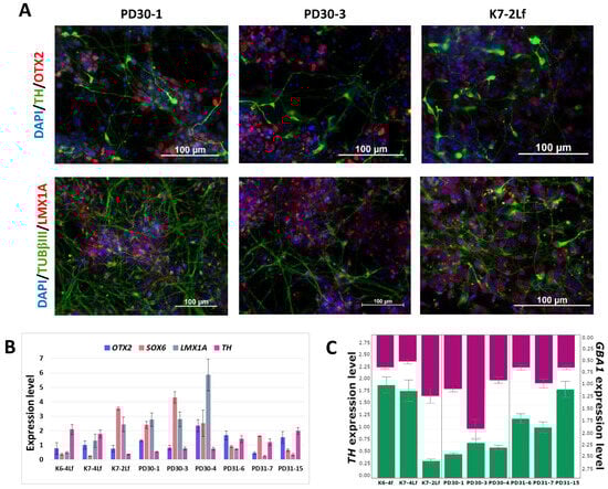 Directed differentiation of the iPSC lines into DA neurons was performed to study the molecular genetic mechanisms of Parkinson’s disease in relevant cell types. We performed directed differentiation of nine iPSC lines: three lines from a Parkinson’s disease patient carrying the N370S GBA1 mutation, 3 iPSC lines from an asymptomatic carrier of the mutation, and three iPSC lines from healthy donors. Three iPSC lines (K7-2Lf, PD30-1 and PD30-3) described in this study. We also used previously generated, characterized and registered in the Human Pluripotent Stem Cell Registry (hPSCreg; https://hpscreg.eu, accessed on 5 February 2024) iPSCs derived from: (1) healthy individuals (K6-4f/ICGi021-A and K7-4Lf/ICGi022-A) []; (2) a patient with Parkinson’s disease associated with the pathogenic variant p.N370S in the GBA1 gene (PD30-4-7/ICGi034-A) []; (3) an asymptomatic carrier of the N370S mutation in the GBA1 gene (PD31-6/ICGi039-A, PD31-7/ICGi039-B, PD31-15/ICGi039-C) []. The efficacy of differentiation was confirmed by immunofluorescence analysis for specific neural markers. All lines showed the presence of the major neural marker TUBβIII, markers for midbrain precursors OTX2 and LMX1A, and a marker for mature DA neurons—tyrosine hydroxylase (TH)—at days 55–60 of differentiation (Figure 2A). The percentage of TH-positive neurons in culture ranges from 30 to 50%.