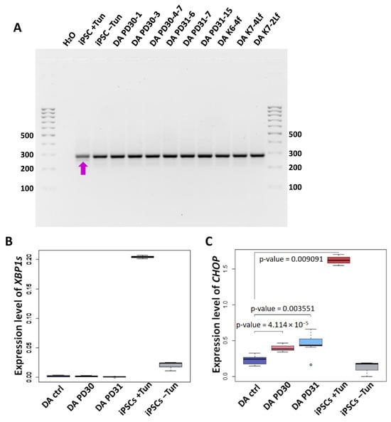 To investigate ER stress and UPR activation in neural derivatives and iPSCs, we conducted a qualitative and quantitative PCR analysis of the spliced mRNA variant of the XBP1 gene that is specific for activated IRE1-XBP1 UPR cascade. Additionally, we examined the expression of the CHOP gene, which activates proapoptotic genes that induce cell death [].