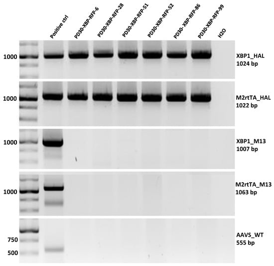 PCR assay for the integration of the XBP1-TagRFP biosensor and its doxycycline-dependent transactivator into the AAVS1 locus. XBP1_HAL—screening for the integration of the XBP1-TagRFP biosensor into the AAVS1 locus, M2rtTA_HAL—screening for the integration of the M2rtTA transgene with a transactivator into the AAVS1 locus, XBP1_M13—screening for the presence of a non-target pXBP1-TagRFP-ERSS plasmid incorporating into the genome, M2rtTA_M13—screening for the presence of a non-target AAVS1-Neo-M2rtTA plasmid incorporating into the genome, AAVS_WT screening against the wild type of the AAVS1 locus.