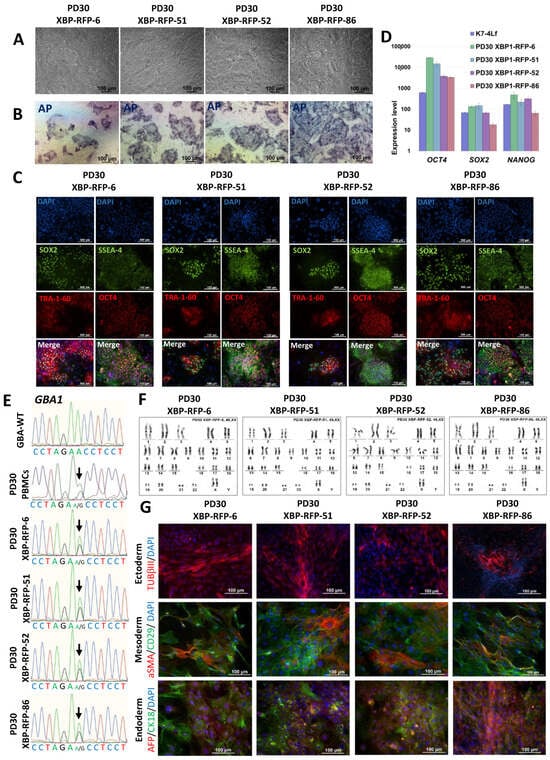 A detailed characterization of the derived lines was carried out, after which they were registered in the Human Pluripotent Stem Cell Registry (https://hpscreg.eu/, accessed on 5 February 2024) with the assigned names ICGi034-A-1 (PD30-XBP-RFP-6, https://hpscreg.eu/cell-line/ICGi034-A-1); ICGi034-A-2 (PD30-XBP-RFP-51, https://hpscreg.eu/cell-line/ICGi034-A-2); ICGi034-A-3 (PD30-XBP-RFP-52, https://hpscreg.eu/cell-line/ICGi034-A-3); ICGi034-A-4 (PD30-XBP-RFP-86, https://hpscreg.eu/cell-line/ICGi034-A-4), all links accessed on 5 February 2024. It was shown that the morphology of the subclones is characteristic for iPSC (Figure 5A); the culture is positively stained for alkaline phosphatase (Figure 5B); the subclones express pluripotency markers, as shown by the results of immunofluorescence analysis (SOX2, TRA-1-60, OCT4, SSEA-4) (Figure 5C) and qPCR (Figure 5D). The previously characterized iPSC K7-4Lf line was used as a reference line for qPCR []. Sanger sequencing confirmed the presence of a pathogenic c.1226A>G substitution in the GBA1 gene in transgenic subclones (Figure 5E). Spontaneous differentiation in embryoid bodies and subsequent immunofluorescence staining for markers of three germ layers revealed the presence of ectoderm (TUBB3/TUJ1), mesoderm (α-smooth muscle actin α-SMA and CD29), endoderm (alpha-fetoprotein (AFP) and cytokeratin 18 (CK18)) (Figure 5G). The PCR test for mycoplasma showed no contamination with this pathogen (Supplementary Figure S2B).