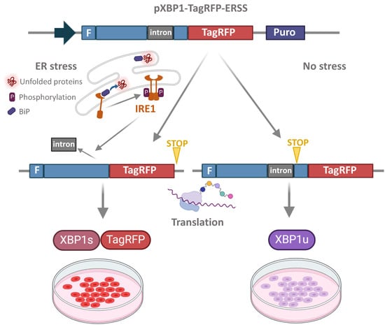 The operating scheme of the UPR activation biosensor is shown in Figure 6. The XBP1-TagRFP sensor construct contains a 26 nucleotide intron that is cleaved by the endoribonuclease IRE1 upon ER stress []. Processing of the XBP1-TagRFP transcript results in a frameshift and the fluorescent protein TagRFP is translated. The red fluorescent signal indicates that the IRE1-XBP1 cascade of the UPR is activated.