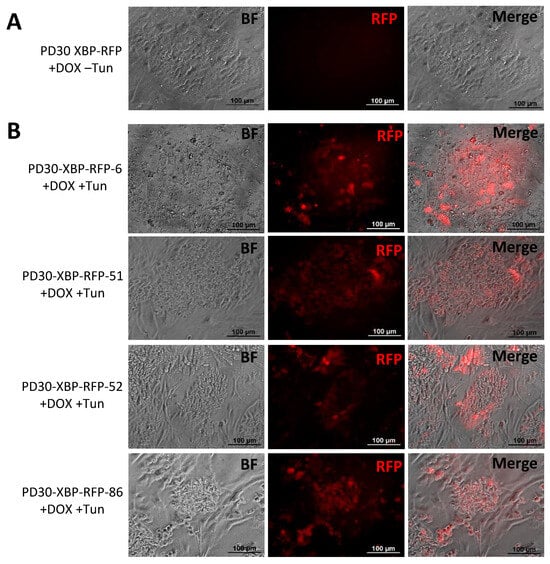 Activation of the XBP1-TagRFP biosensor was performed by adding 2 μg/mL doxycycline (Santa Cruz Biotechnology, Dallas, TX, USA) to the medium for two days. ER stress was induced by adding 5–10 μg/mL tunicamycin (Abcam, Cambridge, UK) to the medium for one day. Images were taken using a Nikon Eclipse Ti-E microscope (Nikon, Tokyo, Japan) and NIS Elements software Advanced Research version 4.30.