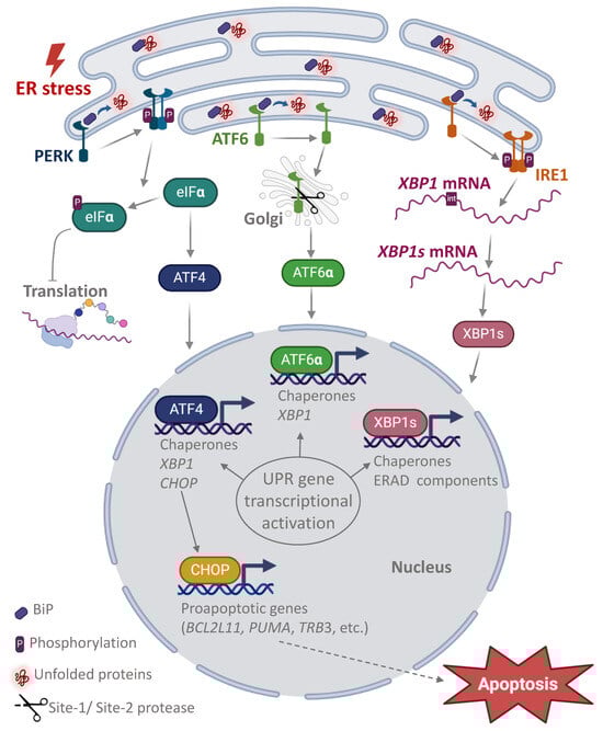 The most important function of the granular ER is protein folding. The acquisition of the correct conformation of proteins is ensured by resident proteins and chaperones. However, the accumulation of misfolded proteins in the lumen of the ER can lead to a condition called “ER stress”. To relieve ER stress and restore protein homeostasis, the UPR pathways are activated in the cell. The UPR is divided into three branches, each of which is activated by a specific transmembrane protein: protein kinase RNA (PKR)-like ER kinase (PERK), activating transcription factor-6 (ATF6), inositol-requiring enzyme 1 (IRE1) (Figure 8). All three UPR pathways contribute to the normalization of the ER in the early stages of the response by activating chaperone genes and expressing XBP1, which is processed at the RNA level by IRE1 to develop a functional protein [,,,,].