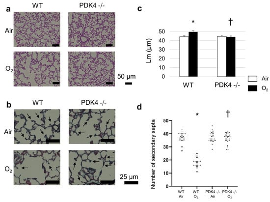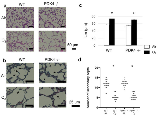 3.1. At 4 Days of Age, Neonatal Hyperoxia Compromised Alveolar Development in Both Wild-Type (WT) and PDK4−/− Mice, Suggesting a Deleterious Impact on Lung Maturation Regardless of PDK4 Status