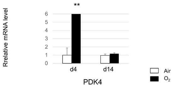 3.2. The Compromised Alveolar Development Noted in PDK4−/− Mice at 4 Days of Age Exhibited Substantial Recovery by the Age of 14 Days, Suggesting the Presence of a Potential Compensatory Mechanism or Inherent Resilience in Lung Maturation over Time