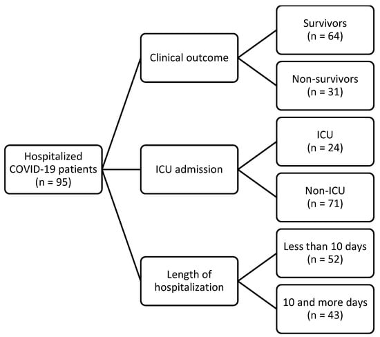 - Batista, F.d.M.; Puga, M.A.M.; da Silva, P.V.; Oliveira, R.; dos Santos, P.C.P.; da Silva, B.O.; Tatara, M.B.; Tsuha, D.H.; Pires, M.A.d.S.; Gonçalves, C.C.M.; et al. Serum biomarkers associated with SARS-CoV-2 severity. Sci. Rep. 2022, 12, 15999. [Google Scholar] [CrossRef]