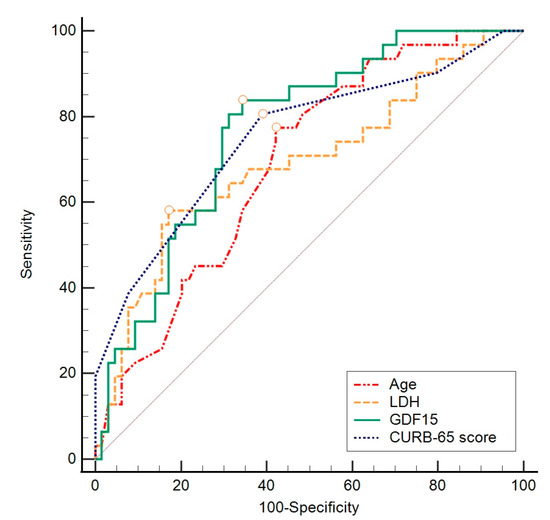 - Romualdo, L.G.d.G.; Mulero, M.D.R.; Olivo, M.H.; Rojas, C.R.; Arenas, V.R.; Morales, M.G.; Abellán, A.B.; Conesa-Zamora, P.; García-García, J.; Hernández, A.C.; et al. Circulating levels of GDF-15 and calprotectin for prediction of in-hospital mortality in COVID-19 patients: A case series. J. Infect. 2021, 82, e40. [Google Scholar] [CrossRef]