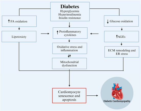 The pathophysiological mechanisms of DCM are multifactorial, encompassing metabolic alteration, AGE accumulation, mitochondrial dysfunction, lipotoxicity, glucotoxicity, inflammation, and oxidative stress (Figure 2) [19,20,21].