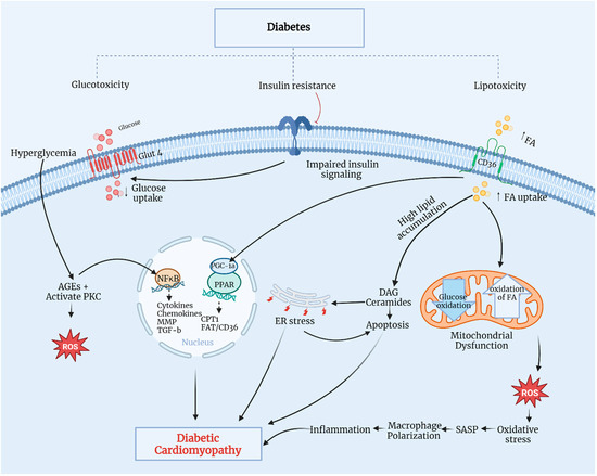 Persistent hyperglycemia in diabetic patients leads to metabolic dysregulation in cardiomyocytes, including insulin resistance, increased fatty acid (FA) uptake, and impaired glucose utilization. Typically, 70% of myocardial energy comes from FA oxidation, with the remaining 30% derived from glucose metabolism through mitochondrial oxidative phosphorylation [22]. Insulin-impaired action on adipose tissue and the liver contributes to increased lipolysis, thereby elevating blood FA contents and promoting the overexpression of a cluster of differentiation 36, essential for FA uptake, eventually leading to increased FA oxidation. Additionally, insulin resistance causes hyperinsulinemia and impaired insulin signaling, inhibiting glucose transporter 4-mediated glucose uptake. This triggers the overproduction of reactive oxygen species (ROS) in the mitochondrial respiratory chain, reducing myocardial contractility and promoting myocardial fibrosis—a hallmark of DCM. Elevated ROS production leads to oxidative stress and myocyte inflammation, causing lipid accumulation and lipotoxicity [23,24]. Excessive FA can metabolize through non-oxidative pathways, forming lipotoxic intermediates, such as ceramides and diacylglycerol. These intermediates lead to endoplasmic reticulum stress and cardiomyocyte apoptosis, ultimately progressing to DCM. Prolonged hyperglycemia promotes AGE formation and protein kinase-C activation, which initiates oxidative stress by stimulating ROS production, ultimately causing oxidative damage to cardiomyocytes and impaired myocardial contractility [25,26]. A significant increase in AGEs triggers nuclear factor kappa-B (NF-κB) signaling pathways, thereby inducing inflammation, cytokine and chemokine production, and profibrotic factor activation, such as matrix metalloproteinase (MMP) and transforming growth factor-beta (TGF-β), as well as myocyte apoptosis. These pathways can induce functional and structural damage, leading to cardiomyocyte death, left ventricular remodeling, and systolic dysfunction [23]. Elevated FA accumulation activates the peroxisome proliferator-activated receptors-α and -γ (PPARα/PPARγ) cofactor-1α pathway, enhancing the transcription of genes for FA uptake and oxidation regulation. The overexpression of PPARα in the heart increases FA absorption and oxidation, leading to reduced mitochondrial function, the loss of metabolic flexibility, and ROS production by the mitochondria [21]. In diabetes mellitus, coronary microvascular dysfunction is an important characteristic of diabetes mellitus-related complications. It is linked to various other risk factors that significantly affect cardiovascular disease morbidity and mortality. Chronic uncontrolled high blood glucose contributes significantly to the dysfunction of microcirculation as a common chronic feature. The pathogenesis of this microvascular complication is complex and not completely understood [27]. However, hyperglycemia contributes to the activation of various signaling pathways at microvascular levels, resulting in the remodeling of the microvessels as well as myocardial tissue, with possible impairment of the microvascular supply to the myocardium [28]. Microvascular remodeling includes the thickening of the arteriole wall, the narrowing of the lumen, fibrosis, and capillary rarefaction. Similarly, hypertension is another risk factor that leads to coronary microvascular alterations and promotes the progression of endothelial dysfunction and capillary rarefaction [29]. Hypertension-induced changes in myocardial morphology and function also contribute to left ventricular hypertrophy and myocardial fibrosis [29]; indeed, hypertension and type 2 diabetes are common comorbidities. Accordingly, uncontrolled blood glucose levels and blood pressure are interlinked because of diabetes-related or hypertension-related cardiovascular complications associated primarily with microvascular function deterioration. Both diseases can stimulate a mutual molecular mechanism, such as oxidative stress, inflammatory and immune system activation, and others. All of these are linked to microvascular dysfunctions that possibly contribute to the relationship between diabetes, hypertension, and coronary microvascular disorders [30]. Furthermore, overactivated macrophages contribute to oxidative stress and mitochondrial damage through ROS overexpression, resulting in progressive cardiac dysfunction and cardiomyopathy.