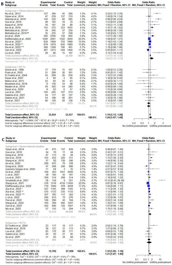 Subgroup analyses of interested FET outcomes in women with and without GnRHa pretreatment. (A) Subgroup analysis of study design. (B) Subgroup analysis of the type of GnRHa (C) Subgroup analysis of the duration of pituitary suppression with GnRHa.