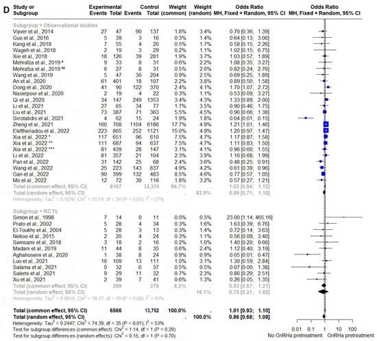 On the other hand, subset meta-analysis of normal ovulatory women with regular menstruation as an inclusion criterion demonstrated high heterogeneity with no significant improvements in pregnancy outcomes, including CPR (OR = 1.63, 95% CI: 0.98–2.71, I2 = 76.7%, p = 0.06), IR (OR = 1.29, 95% CI: 0.82–2.04, I2 = 60.7%, p = 0.21), LBR (OR = 2.14, 95% CI: 0.82–5.58, I2 = 86.6%, p = 0.10) and MR (OR = 0.56, 95% CI: 0.19–1.63, I2 = 73.3%, p = 0.23) among those pretreated with GnRHa (Figure 4 and Supplementary Figure S7).