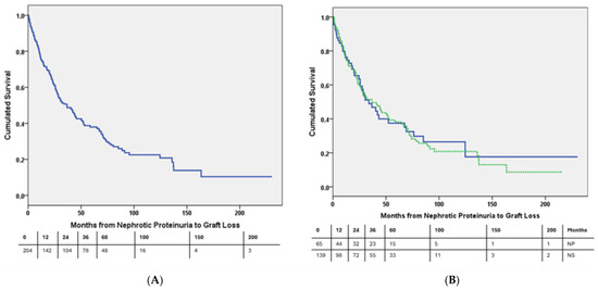 - From 1/01/2000 to 1/09/2023, 1098 patients received a kidney transplant at our center, and 204 (18.6%) developed proteinuria >3 g/day (NP) at a median post-transplant time of 55.3 months (20.45–101.69). Among them, 139 (68.1%) also developed nephrotic syndrome (NS) with hypoalbuminemia; therefore, the prevalence of NS after a kidney transplant was 12.6% in our series. The mean patient characteristics and a comparison between those who developed nephrotic syndrome and those who did not are shown in Table 1.
