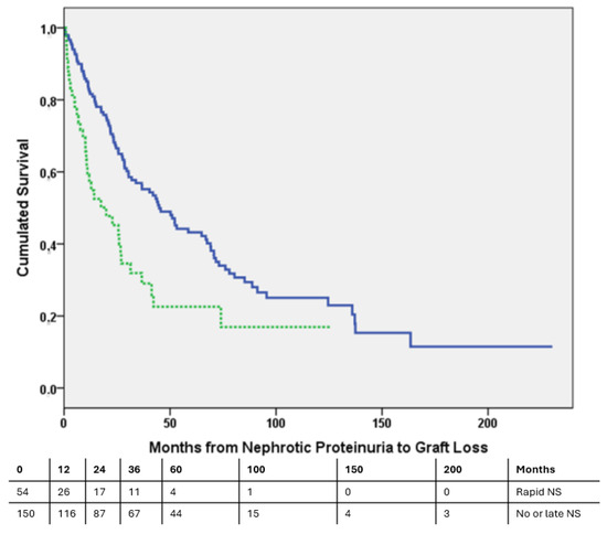 The systematic measurement of a recipient’s proteinuria and serum albumin during follow-up visits after kidney transplantation allowed us to analyze whether the time from the onset of NP to the development of NS had repercussions on graft survival in patients with NS. We observed that the 54 patients with early NS (hypoalbuminemia that appeared within three months after NP) exhibited a significantly worse graft survival than the 150 patients with late NS or without NS (Cox multivariate analysis corrected by the GFR, HR 1.711, 95% CI 1.147–2.553, p = 0.008). Speculatively, this rapid onset of NS could indicate a higher degree of podocytopathy. Further studies should be conducted to validate these results, as they have not been previously reported. Nevertheless, we believe that identifying this subgroup of patients could guide more aggressive therapeutic measures with the aim of preventing these catastrophic renal outcomes.