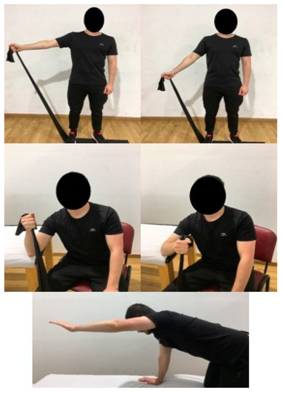 The EE protocol includes 3 exercises, with 3 sets of 10 repetitions of each exercise, twice a day, for four weeks [11,19]. The first exercise focuses on the supraspinatus; the patient is standing and must perform shoulder abduction (concentric phase) followed by adduction of the same slowly (eccentric phase), with resistance from an elastic band [11,12,45]. The focus of the second exercise is the infraspinatus, from the seated position; the concentric phase will depend on external rotation, slowly returning to the initial position towards internal rotation [11,12,45]. The last of the exercises focuses on global shoulder stability; the subject is placed in a quadruped position, concentric phase in shoulder flexion and eccentric phase in the return movement [11,12,45] (Figure 4).