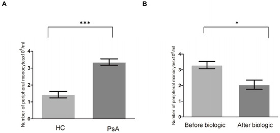 The number of peripheral CD14+ monocytes is higher in patients with PsA than in healthy controls (HCs), and it returned to the level of HCs after successful biologic treatment. (A) The CD14+ monocytes were analyzed from patients with PsA (n = 15) and HCs (n = 15). (B) To investigate the change in the number of CD14+ monocytes in patients with PsA after successful biologic treatment, the CD14+ monocytes were analyzed from eight patients with PsA before and 7 months after successful biologic treatment. * denotes p value < 0.05 and *** denotes p value < 0.001 based on Mann–Whitney U test.