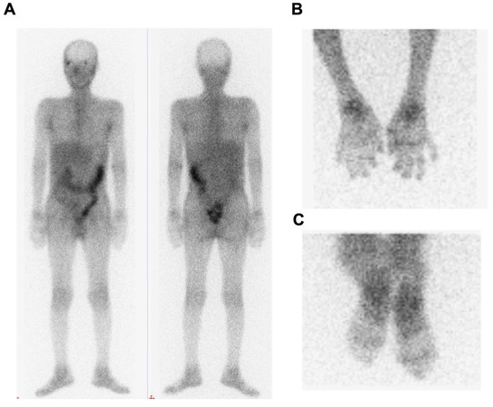 Increased activity of 67Ga in a patient with PsA. A 58-year-old man was diagnosed with psoriasis for 3 years. He developed psoriatic arthritis with multiple tender and swollen joints for 6 months. The 67Ga scan shows enhanced accumulations of the radiotracer in bilateral wrists, hands, knees, ankles, and feet (A). The images of bilateral hands (B) and bilateral feet (C) showed intense 67Ga uptake.