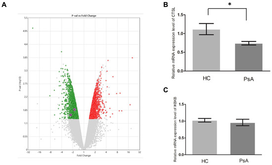 The gene expression profiles were examined using microarray and qPCR assays. (A) We used a volcano plot (generated using Transcription Analysis Console 4.0) to illustrate the results of the microarray assays examining the monocyte samples from two HCs and two subjects with PsA. The red and green dots denote the upregulated and downregulated genes in the PsA samples, respectively (p value < 0.05 based on ANOVA). (B,C) The qPCR results compared nine HC and nine PsA monocyte samples with 18S as the internal control gene. * Denotes p value < 0.05 based on Mann–Whitney U test.