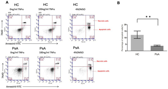 The apoptosis of CD14+ monocytes from healthy controls and patients with PsA after TNF-α treatment. CD14+ monocytes from patients with PsA and HCs were cultured with 100 ng/mL TNF-α for the evaluation of apoptosis using flow cytometry. (A) The apoptosis of CD14+ monocytes from patients with PsA and HCs was measured by flow cytometry. (B) The percentage of apoptotic cells from CD14+ monocytes of patients with PsA (n = 6) and HCs (n = 6) was measured. ** Denotes p value < 0.01 based on Mann–Whitney U test.