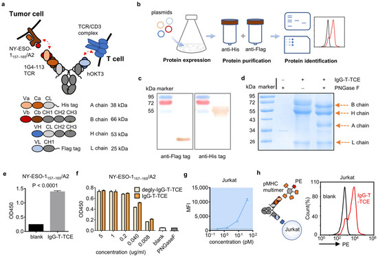 Structure and characterization of IgG-T-TCE. (a) Schematic diagram of IgG-T-TCE-NY structure. Red arrows indicate the simultaneous binding of IgG-T-TCE-NY to NY-ESO-1157–165/HLA-A*02:01 on tumor cell and human CD3 on T cell. The MW of each chain was estimated using ExPASy. (b) Flow diagram of IgG-T-TCE preparation. (c) Western blot analysis of IgG-T-TCE-NY. (d) Reducing SDS-PAGE analysis of IgG-T-TCE-NY with/without deglycosylation operation. The position of each band matched the estimated size of each chain of IgG-T-TCE-NY after deglycosylation. (e) ELISA assay for testing the affinity of IgG-T-TCE-NY to NY-ESO-1157–165/HLA-A*02:01. The blank group was incubated with PBS instead of IgG-T-TCE-NY. The t-test of these two groups was performed using GraphPad. p value was lower than 0.0001. (f) ELISA assay for comparing the affinity of IgG-T-TCE-NY to NY-ESO-1157–165/HLA-A*02:01 with/without the deglycosylation operation. PNGase F alone and a blank group incubated with PBS instead of IgG-T-TCE-NY were set as controls. (g) Binding ability of IgG-T-TCE-NY to Jurkat cells measured with FACS. (h) The simultaneous binding of IgG-T-TCE-NY to NY-ESO-1157–165/HLA-A*02:01 and human CD3 was identified with FACS using the sandwich method. The pMHC multimer tagged with PE could bind IgG-T-TCE-NY caught by the hCD3 on Jurkat cells. The blank group was incubated with PBS instead of IgG-T-TCE-NY. Data are means ± SD, n = 3.