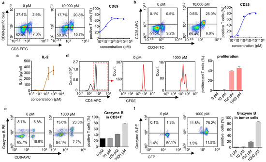 T cell activation was the pre-step for T cell engagers to kill tumor cells. T cells in an activated state change in several respects compared with naive T cells, such as surface protein expression, cytokine secretion, etc. We first detected CD69 (early activation marker) and CD25 (late activation marker) expression of T cells in co-culture (PBMC + drug + NY-ESO-1+ HLA-A*0201+ tumor cell line; E:T = 4:1) after 72 h with FACS. CD69 and CD25 were more up-regulated, and there was an increased IgG-T-TCE-NY concentration (Figure 2a,b). A similar result was observed in the IL-2-detecting experiment in co-culture (Figure 2c). Moreover, we labeled PBMCs with CFSE to see if T cells in co-culture proliferated. After 96 h, T cells proliferated obviously in conditions with a high concentration of IgG-T-TCE-NY (Figure 2d). Overall, the results showed the induced activation of T cells with IgG-T-TCE-NY.