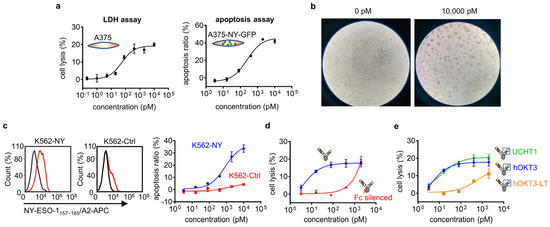To confirm that IgG-T-TCE-NY can redirect T cells to kill positive tumor cells, the LDH assay and apoptosis assay were conducted for A375 (Figure 3a, left) and A375-NY-GFP (Figure 3a, right), respectively. Both results showed increased tumor-cell killing with the increased concentration of IgG-T-TCE-NY. The killing effect was directly reflected in comparisons of images of co-culture cells, which showed that the number of tumor cells decreased and the morphology of tumor cells changed clearly after adding IgG-T-TCE-NY (Figure 3b).