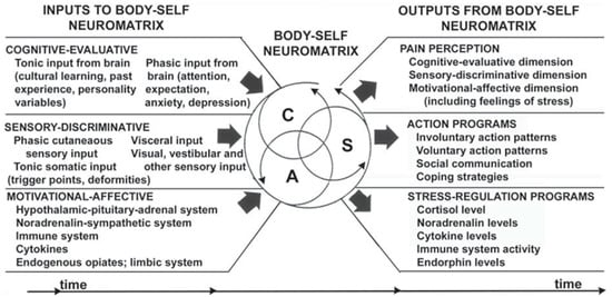 “Factors that contribute to the patterns of activity generated by the body-self neuromatrix, which comprises sensory, affective, and cognitive neuromodules. The output patterns from the neuromatrix produce the multiple dimensions of pain experience as well as concurrent homeostatic and behavioral responses”. © American Dental Education Association. Reproduced with permission from [].