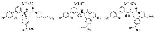 All compounds that are currently examined can be described as sulfonylated tertiary amides of the unnatural amino acid Phe(3-Am). The N terminus of the Phe(3-Am) is coupled with a 2′,4′ disubstituted (either dichloro- or dimethoxy) 3-sulphonyl-biphenyl moiety, while its carboxyl group is amidated with various piperidine derivatives containing either a terminal free amino or an ureido group. The benzamidine moiety in the side chain of Phe(3-Am) is a strongly basic group, and the best antibacterial effects were found for dibasic compounds, which contain an additional amino group on the piperidine moiety. In contrast, a negligible antibacterial effect was observed for compound MI-490, although it is also a dibasic inhibitor containing its second basic group in a different position at the N-terminal biphenyl moiety. Furthermore, all of the most effective compounds (MIC values against S. suis: MI-432, <1.5625 µM; MI-471, 3.125 µM; MI-476, 6.25 µM) contain an N-terminal 2′,4′ disubstituted biphenyl moiety. Notably, the 2′,4′-dichloro-substituted compounds have a stronger antibacterial activity compared with the otherwise structurally similar 2′,4′-dimethoxy-substituted derivatives, and the latter compounds had to be used at significantly larger concentrations. In addition, no measurable antibacterial effect against any of the tested strains was found for the monobasic compound MI-463, which contains a very bulky cyclohexyl-substituted C-terminal ureido group.