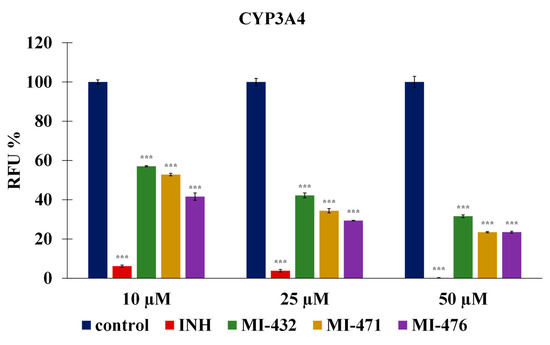 The effect of the protease inhibitors at 10 µM, 25 µM, and 50 µM on human hepatic microsomal CYP3A4 isoenzyme function. The microsomal preparations were treated by the inhibitors for 15 min at 37 °C. The reference inhibitor ketoconazole (INH) was used at a concentration of 5 µM and significantly suppressed CYP3A4 activities in humans (*** p < 0.001). The expressed data are the mean relative fluorescence intensities (RFUs) shown as a percentage of the untreated control fluorescence values ± SD (n = 3); *** signifies p < 0.001 compared to controls.