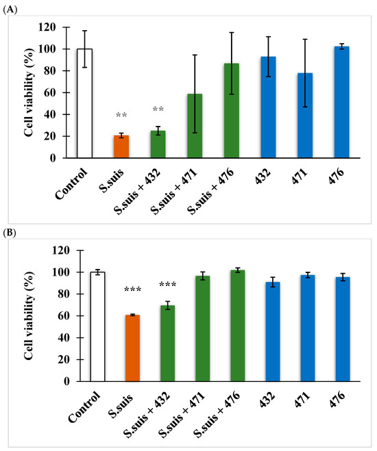 Determination of cell viability in IPEC-J2 cells (A) and swine hepatocytes (B). Changes in cell viability determined by absorbance measurements after 24 h of administration of 104 CFU/mL S. suis, (MI-)432, (MI-)471, and (MI-)476 at 50 µM and their combinations. Data are represented as cell viability % expressed in control % with standard errors of mean (SEM), n = 3–4 samples per group. ** indicates p < 0.01 and *** signifies p < 0.001 compared to controls.