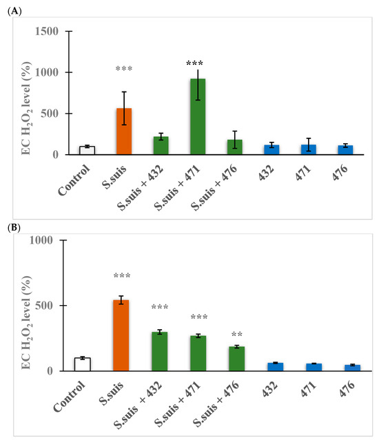 Measurement of EC H₂O₂ production after treatment with S. suis (104 CFU/mL) alone or in combination with the indicated inhibitors (MI-)432, (MI-)471, and (MI-)476 at a concentration of 50 µM in IPEC-J2 cells (A) and in hepatocytes (B) using the Amplex red method. The EC H2O2 levels were determined by measurements of the relative fluorescence intensities compared to the control (100%) with standard errors of mean (SEM), n = 3 samples per group. ** signifies p < 0.01, and *** signifies p < 0.001 compared to controls.