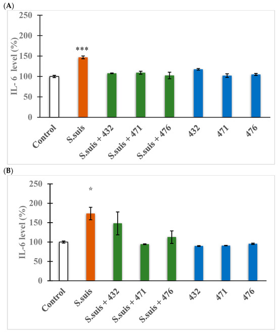 Measurement of interleukin-6 production after 24 h treatment with S. suis (104 CFU/mL) alone or in combination with the indicated inhibitors (MI-)432, (MI-)471, and (MI-)476 or with the inhibitors alone in IPEC-J2 cells (A) and in hepatocytes (B). Data are represented as IL-6 levels % expressed in control with standard errors of mean (SEM), n = 3–4 samples per group. * signifies p < 0.05 and *** indicates p < 0.001 compared to controls.