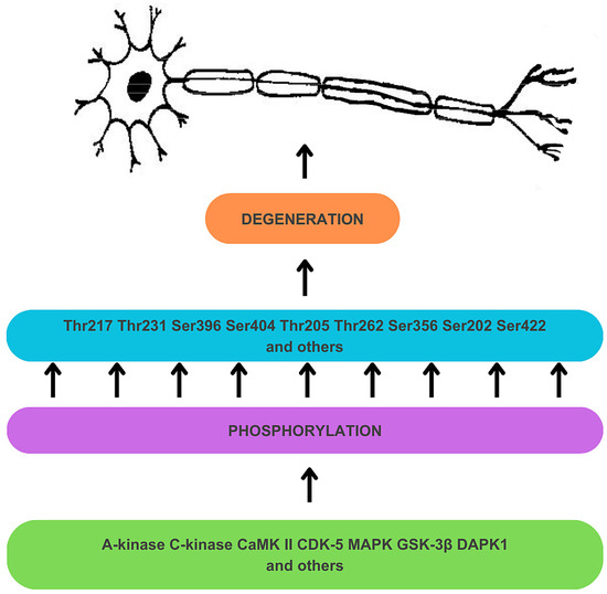 Post-translational modifications, including phosphorylation, N- and O-glycosylation, ubiquitination, truncation, and oxidation, regulate the interaction between tau and MTs [50,55]. Among them, the most important role in the pathogenesis of tau is played by phosphorylation, which is directly related to the pathophysiology of AD [52].