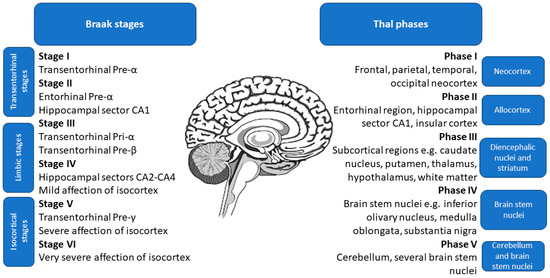 - Thal, D.R.; Rüb, U.; Orantes, M.; Braak, H. Phases of Aβ-Deposition in the Human Brain and Its Relevance for the Development of AD. Neurology 2002, 58, 1791–1800. [Google Scholar] [CrossRef]