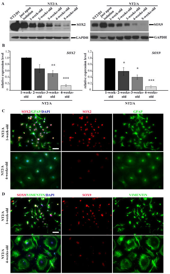 In vitro, our results showed a gradual decrease in SOX2 and SOX9 during the differentiation process from NT2/D1 to NT2/A (Figure 2A). We detected the highest expression of SOX2 in undifferentiated parental NT2/D1 cells, which is expected since these cells resemble early embryonic stem cells [40]. Gradual down-regulation of SOX2 at protein and mRNA levels (Figure 2A,B) was observed by the fourth week of in vitro maturation when NT2/A reached quiescence [26,27]. Similarly, we detected the highest SOX9 expression in astrocytes at the earliest stage of the NT2/A maturation process (just upon isolation, Figure 2A) and a gradual decrease in its expression in maturing astrocytes at protein and mRNA levels (Figure 2A,B).