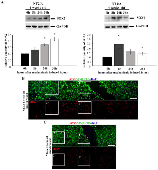 The confluent monolayer of 4-week-old NT2/A was scratched, and SOX2 and SOX9 expression levels were analyzed by Western blot at 8, 24, and 36 h post-scratch-induced injury (Figure 3A). At all time points analyzed, an increase in the expression levels of both transcription factors was observed compared to time 0 h (the time point at which scratch injury was induced). Interestingly, the peak of SOX2 expression level was detected 36 h post-injury, with an approximately two-fold increase (2.2 ± 0.15) compared to the time point 0 h (Figure 3A). In the case of SOX9, the highest expression level was detected 8 h after scratch-induced injury, reaching approximately a 2.5-fold increase (2.5 ± 0.75) compared to time point 0 h (Figure 3A).