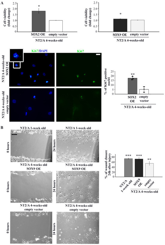 The analysis of proliferation and migration capabilities of 4-week-old NT2/A transduced with SOX2 and SOX9 expression vectors. (A) Relative cell viability of 4-week-old NT2/A after transduction with SOX2 or SOX9 expression vectors (indicated as SOX2 OE and SOX9 OE, where OE stands for overexpression) was measured by MTS assay and compared with the viability of cells transduced with the corresponding empty vector (control). Data presented are means ± SEM (n = 3); p-values were calculated using Student’s t-test: * p ≤ 0.05. Representative images of Ki67 immunostaining (green) of 4-week-old NT2/A transduced with SOX2 expression vector or empty vector (control) counterstained with nuclear marker DAPI (blue). The boxed region is magnified to show the nuclear localization of Ki67. Micrographs were taken using a 60× objective. Scale bar—20 µm. The percentage of Ki67+ cells presented in the chart was calculated relative to the total number of DAPI-labeled nuclei in three independent experiments. Data represent means ± SEM, and p-values were calculated using Student’s t-test: ** p ≤ 0.01. (B) Representative phase contrast images of wound closure experiments. The migratory capability of 1-week-old NT2/A and 4-week-old NT2/A transduced with SOX9 expression vector or empty vector (control) was measured 24 h after scratch injury. Scale bar—100 µm. The statistical analysis of the percentage of wound closure was obtained from three independent experiments. Data represent means ± SEM, and p-values were calculated using Student’s t-test: ** p ≤ 0.01, *** p ≤ 0.001.