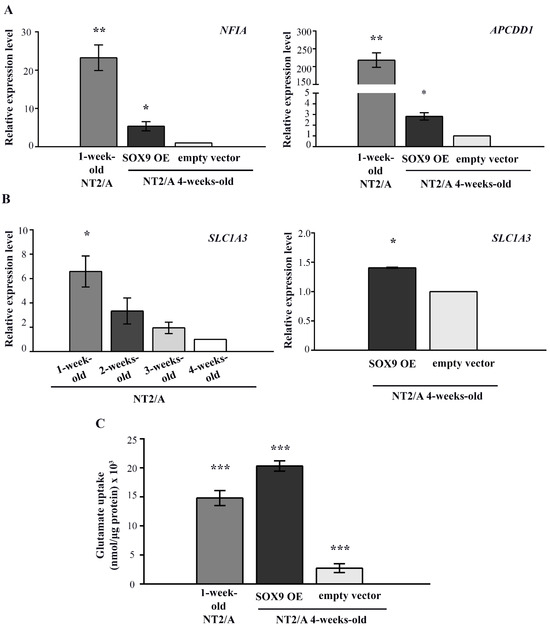 Since SOX9 is also known to induce the expression of glutamate transporter GLAST/EAAT1 during gliogenesis [34], which is known to be essential for the maintenance of synaptic glutamate homeostasis [5], we analyzed its expression during the maturation process of NT2/A and after the transduction of 4-week-old NT2/A with the SOX9 expression vector (Figure 6B). Our result showed a gradual decrease in SLC1A3 gene expression (coding for the GLAST/EAAT1 protein) during the course of NT2/A maturation. Interestingly, although transduction of 4-week-old NT2/A with the SOX9 expression vector induced only a small increase (1.41 ± 0.01) in SLC1A3 expression compared to the NT2/A control, we detected a considerably high capacity of these cells for glutamate uptake (Figure 6B,C). Interestingly, this capability for glutamate uptake is not directly related to SLC1A3 expression levels. Although 1-week-old NT2/A had almost five-fold higher SLC1A3 expression (6.58 ± 1.27) than 4-week-old NT2/A overexpressing SOX9 (1.41 ± 0.01), their ability for glutamate uptake was significantly lower compared to NT2/A overexpressing SOX9 (14.8 nmol/µg and 20.3 nmol/µg, respectively).