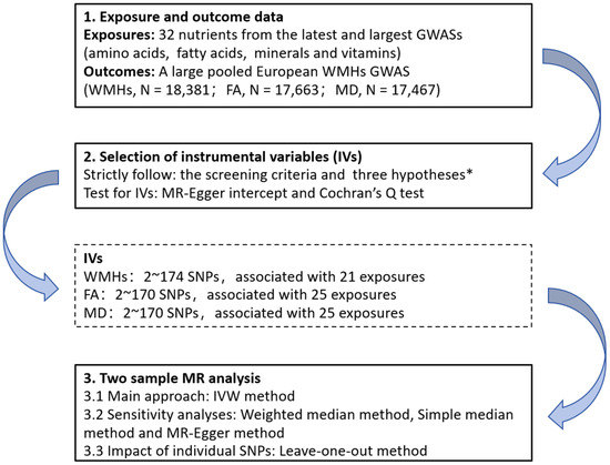 Essential nutrients, including vitamins, amino acids, fatty acids, and minerals, can be obtained from the diet. Previous studies showed that some nutrients, e.g., vitamins, minerals, and ω3 polyunsaturated fatty acids contained in the diet that is rich in vegetables, fruits, nuts, cereals and fish, were associated with the decreased risk of brain aging, cardiovascular diseases, and cognitive impairment [11]. Given that stroke and cognitive impairment are also related to white matter changes, specific diet or nutrients are assumed to play a role in white matter changes, which was supported by a few studies [12,13,14,15,16] while other studies presented inconsistent results [14,16]. The different methodologies, such as nutrient measurement and the duration of observation and intervention, could partially explain the inconsistency and demonstrate the challenges in studies focused on nutrients. Randomized controlled trials (RCTs) have been recognized to overcome the limitations of observational studies and to provide the highest level of evidence [17], but there have been no previous RCTs to determine the effects of essential nutrients on WMHs. Mendelian randomization (MR) analysis can evaluate the causal inference of modifiable factors on disease risk based on genetic data. MR analysis uses single nucleotide polymorphisms (SNPs) as instrumental variables (IVs), mimicking random assignment by naturally assigning alleles, which are less susceptible to confounding bias or reverse causation [18].