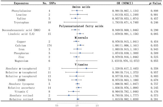 Essential nutrients of several types, namely, amino acids, fatty acids, minerals, and vitamins, were chosen as exposures. Exposure-related SNPs were obtained from the largest genome-wide association studies (GWASs) in European populations that were published most recently and available from PubMed [19,20,21,22,23,24,25,26,27,28,29,30,31,32,33,34]. Amino acid-related SNPs were extracted from isoleucine, leucine, lysine, methionine, phenylalanine, tryptophan, and valine datasets [19,20]. The essential fatty acids considered were ω3 polyunsaturated fatty acids including docosapentaenoic acid (DPA), docosahexaenoic acid (DHA), alpha-linolenic acid (ALA), and eicosapentaenoic acid (EPA) and ω6 polyunsaturated fatty acids including arachidonic acid (AA), dihomogamma-linolenic acid (DGLA), gamma-linolenic acid (GLA), and linoleic acid (LA) [19,21,22]. The chosen essential minerals were calcium [23], copper, iron [24], magnesium [25], phosphorus [26], and zinc [27]. The absolute and relative levels of vitamins or vitaminogens in blood were examined to perform a comprehensive assessment of the impact of vitamins and pro-vitamins on disease. The absolute concentrations of vitamins or pro-vitamins, namely, absolute vitamin A (retinol) [28], absolute β-carotene [29], absolute vitamin B-6 [30], absolute vitamin C (ascorbic acid) [31], relative vitamin C (ascorbic acid) [19], absolute vitamin D [25-hydroxyvitamin D (25OHD)] [32], absolute vitamin E (α-tocopherol) [33], relative vitamin E (α-tocopherol and γ-tocopherol [19], and relative retinol [34], were analyzed.