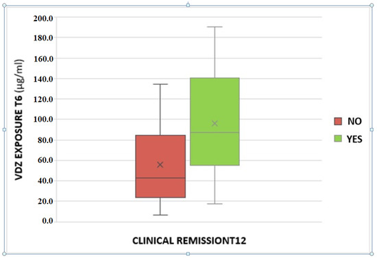 Furthermore, we found an association between VDZ levels at 6 months and clinical remission at 12 months of therapy. In particular, patients in clinical remission showed higher VDZ concentrations; this could be due to better inflammation management with VDZ, which is present in higher concentrations compared to patients without reaching the clinical response. Consequently, a ROC analysis was performed in order to suggest a possible VDZ cut-off value able to predict clinical remission one year after starting therapy; a value of 43.1 μg/mL was identified, with a sensitivity of 81.8% and a specificity of 55.6%. The association was confirmed with calprotectin <250 μg/g at T12, a surrogate marker of mucosal healing.