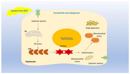 NAFLD is synonymous with lipid accumulation in the liver, which is due to an imbalance between energy intake and energy consumption. Increased energy intake and/or decreased energy consumption leads to lipid storage apart from white adipose tissue (WAT) in ectopic areas, such as the liver, among others [,]. NAFLD results from de novo lipogenesis from carbohydrates in the liver as well as from lipolysis in WAT []. Free fatty acid efflux from WAT together with lipogenesis in the liver leads to hepatic fat aggregation. Excess fat accumulation in the liver may, in turn, lead to the production of lipotoxic species, which induce endoplasmic reticulum (ER) stress and mitochondrial dysfunction []. In particular, the ER is implicated in protein maturation. Excess lipid formation exceeds the ER‘s capacity to produce mature proteins; thereby, unfolded proteins accumulate. This increase in unfolded proteins activates a cascade widely known as the unfolded protein response (UPR). Despite the fact that UPR is activated to promote homeostasis, chronic ER stress may induce the UPR cascade, which, in turn, may lead to severe inflammation, the production of reactive oxygen species (ROS), and, finally, cell death [,,,,,,,]. Figure 1 depicts the involvement of UPR in ER stress and inflammation.