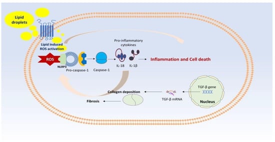 In addition, ROS binds to nucleotide-binding domain-like receptor protein 3 (NLRP3), an inflammasome that, when activated by the canonical inflammasome pathway, i.e., via pro-caspase-1, results in the production of caspase-1. Caspase-1 leads to transformational alterations in NLRP3, which provoke the production of the pro-inflammatory cytokines IL-18 (interleukin-18) and IL-1β (interleukin-1β) [,,,,,,,]. This vicious cycle accounts for the inflammation seen in NASH. In addition, collagen deposition, which is mainly due to the activation of transforming growth factor beta (TGF-β) is responsible for the various degrees of fibrosis seen in NAFLD. Therefore, increased levels of TGF-β together with a long duration of NAFLD may ultimately result in cirrhosis []. Figure 2 depicts the implication of the inflammasome and TGF-β signaling regarding the severity of NAFLD.