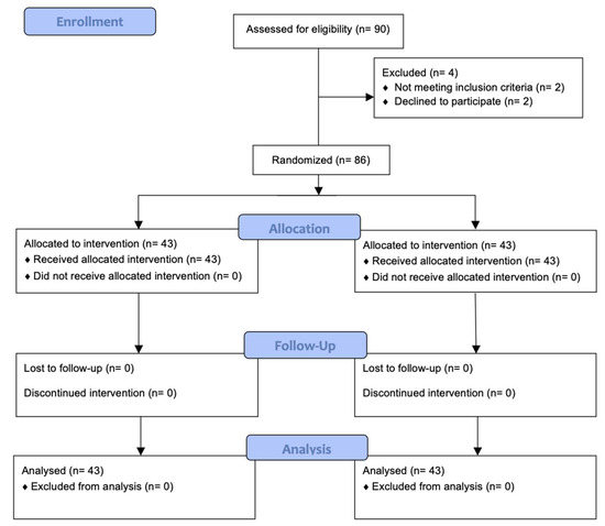 A total of 90 subjects, with ages between 33 and 49 were selected for the trial. After the inscription phase, the final sample included 86 participants (n = 86) (Figure 2), 34 men and 52 women with a mean age of 42 (SD 4.27) years old. Four participants refused to participate in the study and another two did not meet the inclusion criteria as they referred to pain only occurring in the last two weeks. Out of the knees treated, 46 were right knees (54%) while the remaining 40 were left (46%).