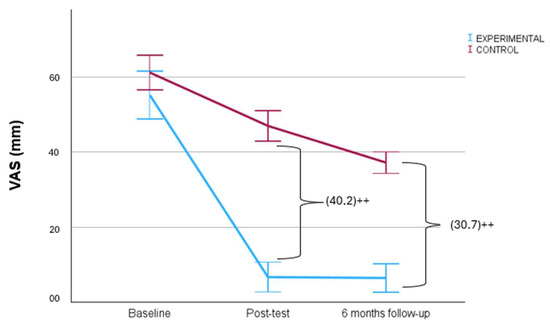 Table 2 includes the baseline, final and six-month follow-up measurements, as well as the between-groups and intra-group mean differences. Statistically significant differences were found to favor the experimental group in pain perception (VAS F1, 84 = 109.74 [p = 0.000]) η2 = 0.56) in knee disability (LEFS: F1, 84 = 16.78 [p = 0.000] η2 = 0.17 and KUJALA: F1, 84 = 13.11 [p = 0.001] η2 = 0.14) and in their range of movement (Flexion: F1, 84 = 49.85 [p = 0.000] η2 = 0.372 and Extension: F1, 84 = 0.95 [p = 0.331] η2 = 0.01). Figure 3 shows the between-group differences in the intensity of pain perceived by participants. No statistically significant differences were found between the before- and after-treatment measurements regarding the use of basic analgesic drugs. Finally, it must be noted that no side effects were observed.