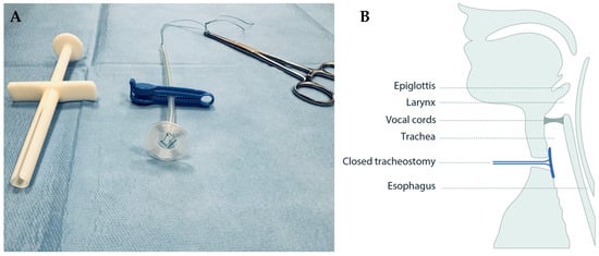 - Christiansen, K.J.; Moeslund, N.; Lauridsen, H.; Devantier, L.; Rohde, M.C.; Kjærgaard, B.; Pedersen, M. Intratracheal Seal Disc: A Novel Tracheostoma Closure Device. Respir. Care 2017, 62, 970–977. [Google Scholar] [CrossRef] [PubMed]